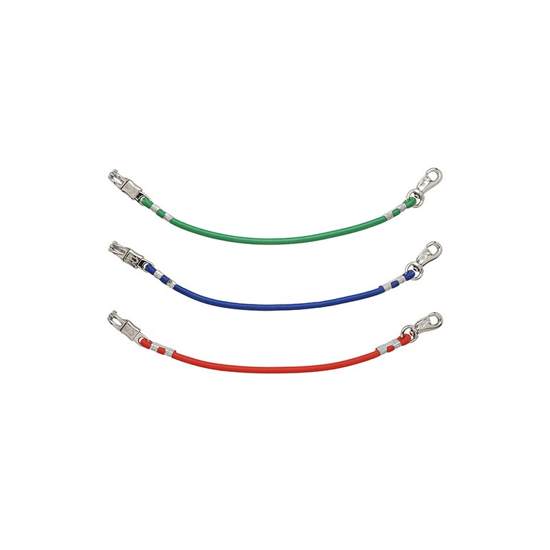 Realizado con goma elástica forrada muy resistente, diámetro 14 mm. Dispone de una mosquetón gatillo muy resistente en un extremo para unir al remolque y otro antipánico en el otro extremo para unir al caballo.