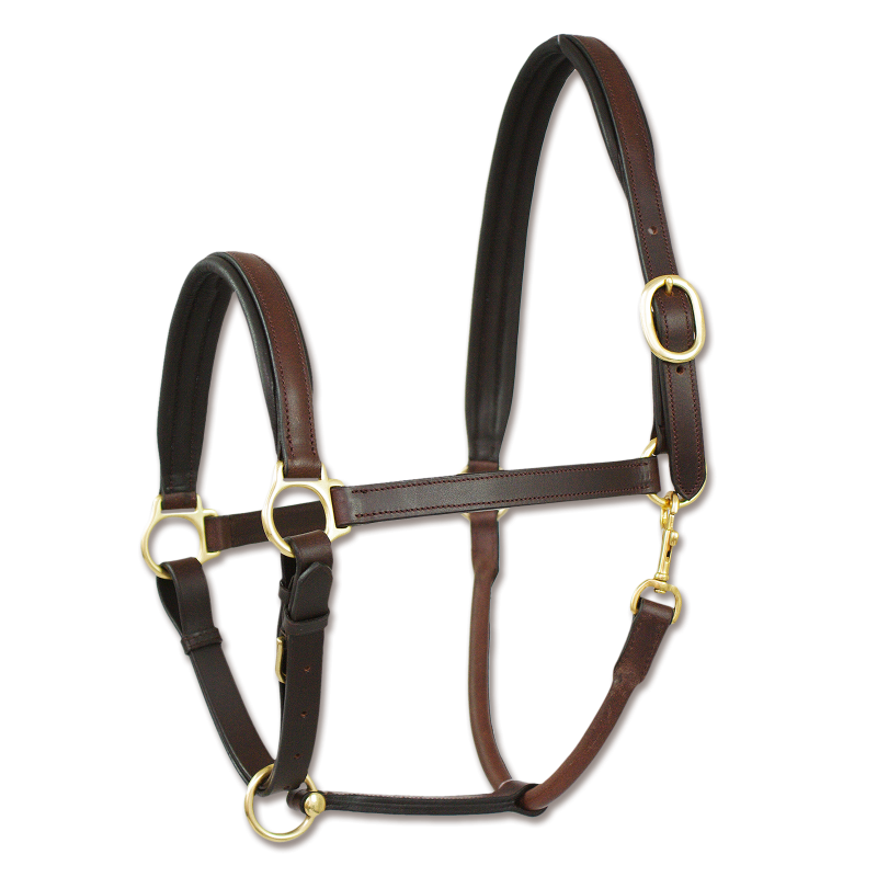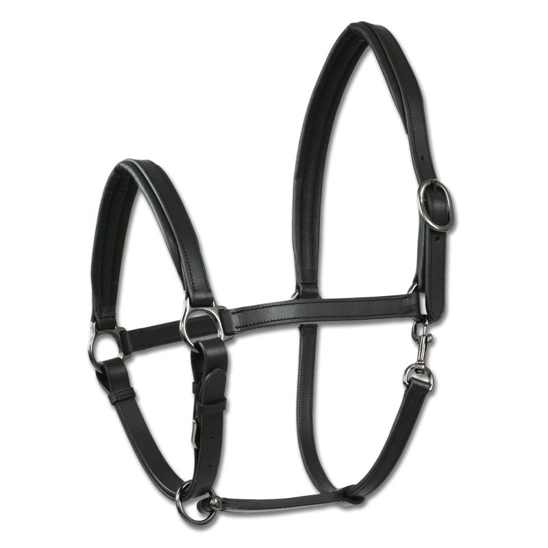Elegante cabezada de cuadra de cuero con acolchado muy blando en la testera y en la muserola. Hebillas refinadas, testera ajustable en ambos lados, ahogadero ajustable.