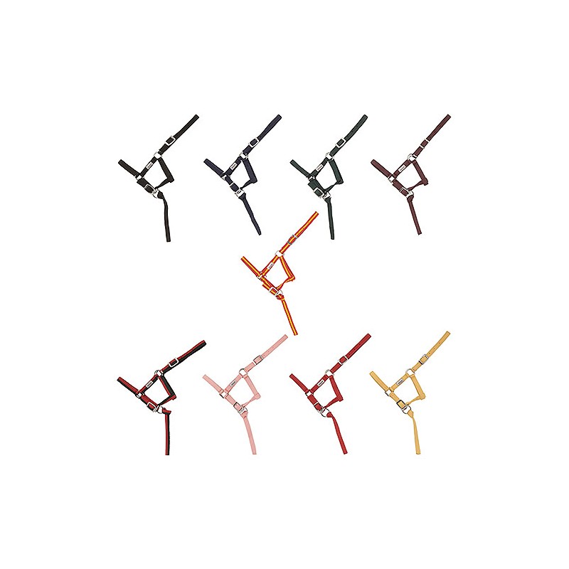 Cabezada de cuadra para potros recién nacidos. Fabricada en nylon resistente y con un ramal corto. Ajuste con hebillas en la barbilla y la testera.