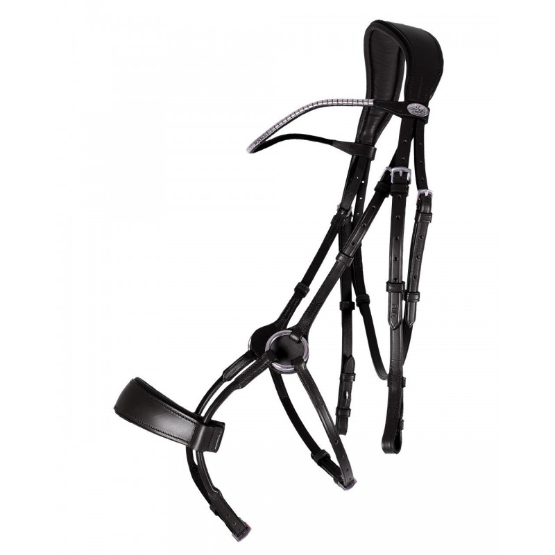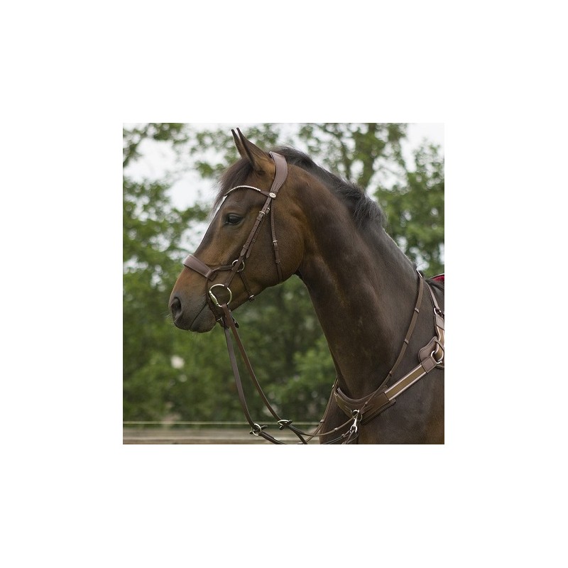 Esta cabezada está especialmente diseñada para evitar los puntos nerviosos de la cabeza del caballo y reparte la presión de manera uniforme. Tanto la banda nasal como la testera están acolchados con gel y forrados de cuero blando para acoplarse perfectamente a la morfología del caballo. Riendas de lona incluidas.
