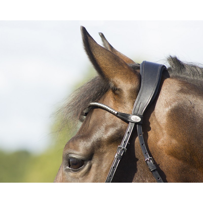 Esta cabezada está especialmente diseñada para evitar los puntos nerviosos de la cabeza del caballo y reparte la presión de manera uniforme. La forma especial de la banda nasal asegura que la línea de la mandíbula y el nervio facial no estén presionadas. La testera anatómica evita la presión sobre los músculos del oído y su perfil extra ancho distribuye mejor y minimiza la presión sobre los músculos de sujeción del cuello. Tanto la banda nasal como la testera están acolchados con gel y forrados de cuero blando para acoplarse perfectamente a la morfología del caballo. Riendas de lona incluidas.