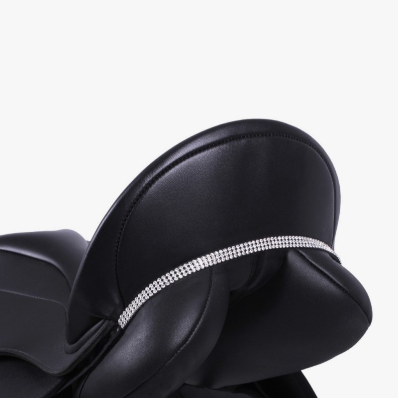 Decoración para silla decorada con pedrería plateada en dos tamaños. La joya se puede unir fácilmente deslizando los lazos alrededor de los faldones de la silla.